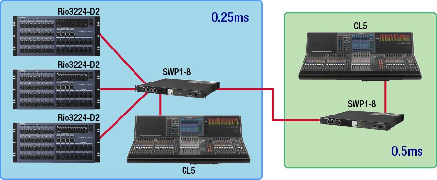 Select an appropriate latency setting based on the number of switches (hops) to the furthest device, including the internal CL/QL/R series switches. If the latency setting is too low, the sound may be distorted or intermittent.