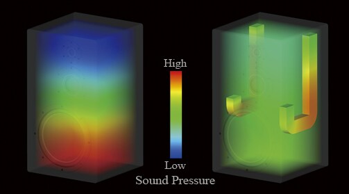 Applying know-how obtained in the development of acoustic conditioning panels, we developed an Acoustic Absorber (patent pending) — a compact J-shaped resonance tube that eliminates standing wave of a specific frequency — and installed two of them in the NS-5000. The speaker's uncomplicated cuboid enclosure helps consolidate internal standing waves at a specific frequency and makes it easy for the Acoustic Absorber to target and suppress that frequency. This eliminates the need for a large amount of sound-absorbing materials inside the enclosure, and helps bring the natural acoustic resonance out of the original music. Acoustic Absorbers also ensure a remarkable continuity in tone between the woofer and the midrange, ensuring that, unlike in a conventional enclosure filled with a substantial amount of sound-absorbing materials, much of the acoustic energy in the high frequency range generated by the woofer is kept intact.