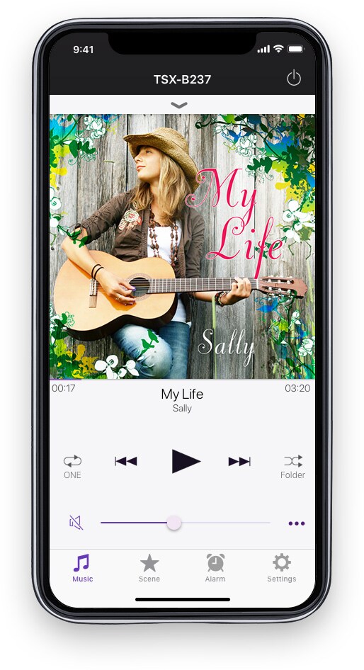 You can remotely control the TSX-B237 from your own smartphone — turning the power on/off, changing the volume and selecting your favorite songs — even if you're away from the TSX.