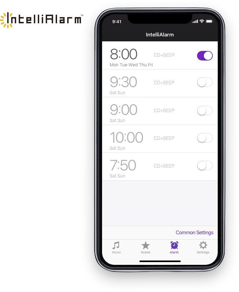 A built-in alarm function, with easy-to-set controls from your smartphone, gently wakes you up. For example, simply set ‘radio’ as the alarm source, and wake up to your favorite radio station in the morning.