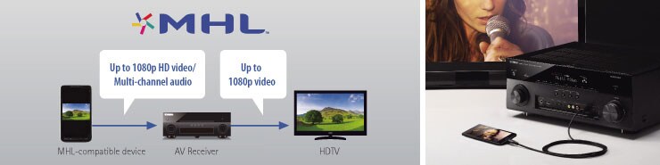 MHL provides easy, direct connection of compatible mobile phones and this AV receiver. Playback of up to 1080p video and multi-channel audio from the phones is supported. The receiver also charges the connected phone. Play, Stop and other basic operations can be controlled from the remote control.
