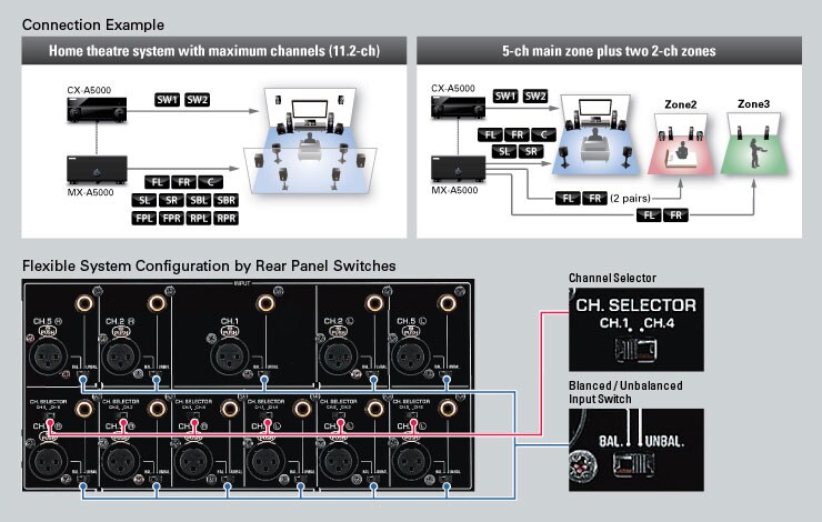 The MX-A5000 and CX-A5000 are designed to allow flexible system building. Complementing their 11-channel output that maximises Cinema DSP HD3 performance and makes the most of the capabilities of the speakers, they also support biamping for driving tweeter and woofer with separate amps. Furthermore, they allow biamping of, for example, all five channels using the 11 internal channels. Extra amps can be used to power multiple zones in addition to the main room, letting you configure your system for music play in a bedroom or kitchen, for example. On the MX-A5000, you can switch all 11-channel input jacks back and forth between balanced and unbalanced for each channel, further increasing system flexibility.