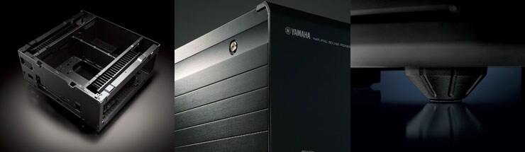 As part of the no-compromise design policy for these two amplifiers, Yamaha created an advanced chassis with strong rigidity. Chassis stiffness is enhanced by an H-shaped cross frame that boosts mechanical strength, by adopting aluminium side panels that increase the stiffness of the housing, and by a three-ply structure with independent top cover and side panels. Any external vibration from the rack or other sources is damped by heavy insulators. The A.R.T (Anti-Resonance Technology) Wedge in the centre of the bottom cover acts as an additional vibration countermeasure and firmly supports the internal circuits and delicate parts. In addition, the MX-A5000 has a double bottom, consisting of vibration control plates made of 1.6mm black steel, the same type of construction used on the previous flagship model Z11. In order to support the heavy heat sinks and other parts, it has a left-right independent construction strengthened by a rigid-frame structure. The bottom frame reduces the transmission of vibration produced by the large power supply transformer and heat sinks. It also incorporates a heavy insulator that blocks external vibration.