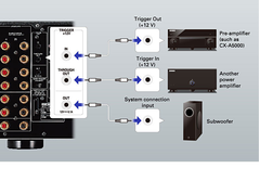 The trigger function allows automatic power synchronisation with other components that support this function. Connecting a preamp, for example, to the Trigger In jack turns the power on and off together with the preamp. Connecting another component such as a subwoofer to the Trigger Out jack syncs the power of that component to the MX-A5000. In addition, the input from the Trigger In jack can be output in a cascade connection to control the power of another component such as another power amplifier (Through Out).