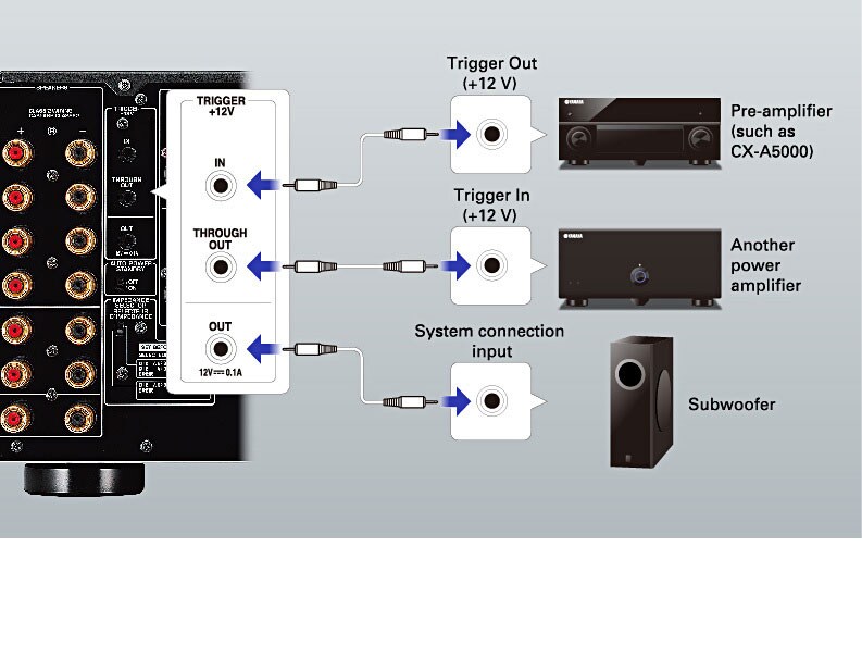 The trigger function allows automatic power synchronisation with other components that support this function. Connecting a preamp, for example, to the Trigger In jack turns the power on and off together with the preamp. Connecting another component such as a subwoofer to the Trigger Out jack syncs the power of that component to the MX-A5000. In addition, the input from the Trigger In jack can be output in a cascade connection to control the power of another component such as another power amplifier (Through Out).