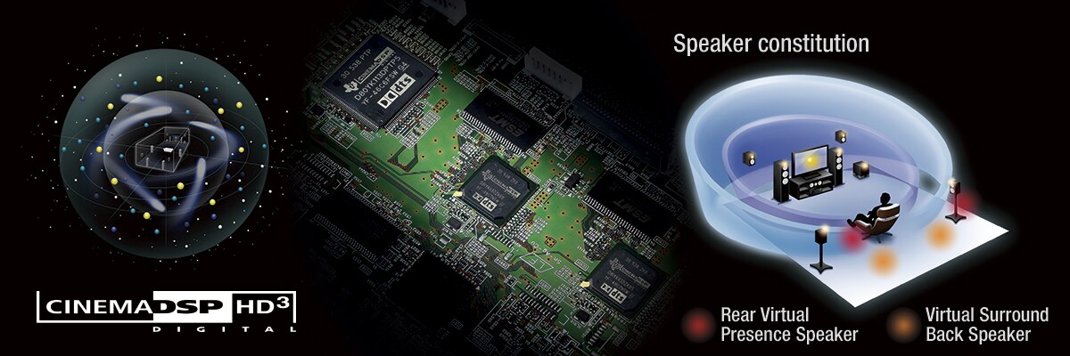 CINEMA DSP 3D provides a wide, high and dense sound field. HD Audio format decoding lets you enjoy HD Audio sources. Virtual Presence Speaker delivers 3-dimensional sound without actual use of presence speakers.