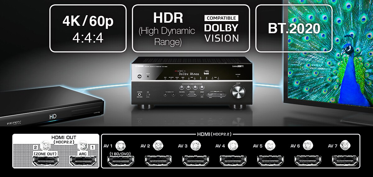 - HDMI® (8 in / 2 out) with 4K Ultra HD full support, HDR Video including Dolby Vision and Hybrid Log-Gamma, and BT.2020
