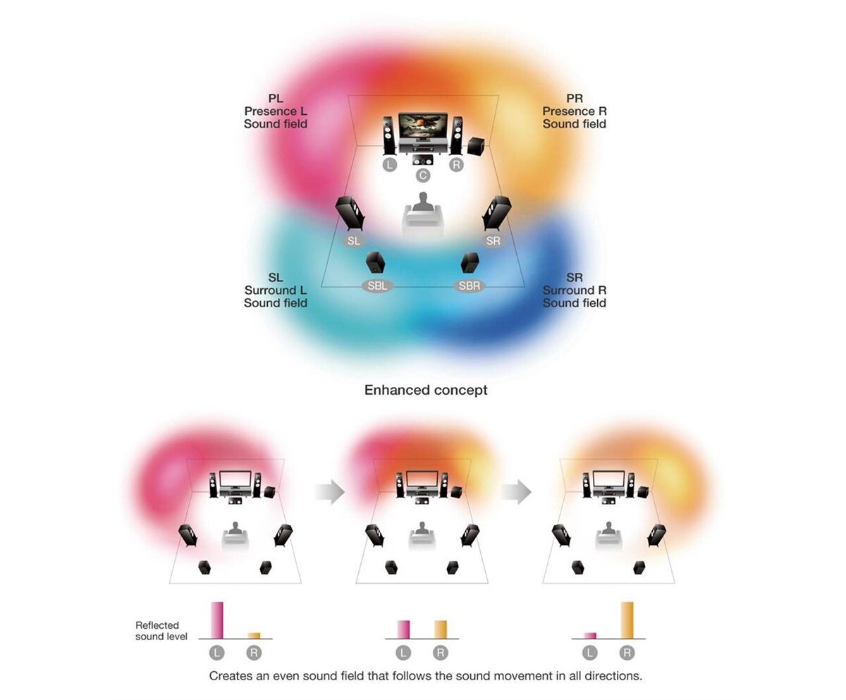 Even when it is impossible to install surround speakers behind the listening position, Virtual CINEMA DSP reproduces virtual 7-channel surround sound filled with realism, from only two front speakers. The Virtual CINEMA FRONT feature lets you place two surround speakers and a centre speaker at the front to enjoy virtual 7-channel surround sound with even higher quality and resolution, as well as superior rear virtual sound localisation. Adding two additional front presence speakers provides a three-dimensional sound field that gives you a feeling of its height and depth and of the vertical movement of the sound. You get more flexibility to arrange your speakers inside the room, along with easy enjoyment of high quality surround sound.