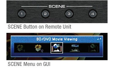 The SCENE PLUS function simplifies operation by providing one touch power-on along with selection of the desired input and the appropriate DSP programmes. SCENE PLUS offers a choice of 12 SCENE selections, four of which can be assigned to the second zone in a multi-zone system. The inputs can be set to specific sources, such as an FM or Internet radio station, a station on a streaming service, a USB device or a song on a PC or NAS (network). SCENE PLUS can be selected from the front panel, remote control, GUI and even from the AV Controller app.