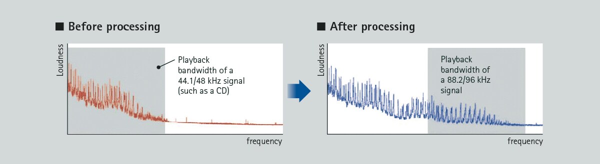 Hi-bit high-sampling extension up to 96 kHz / 24-bit can be applied to lossless 44.1 / 48 kHz content such as from a CD (2-channel PCM) or a FLAC file for further heightening of the musicality in the original content.