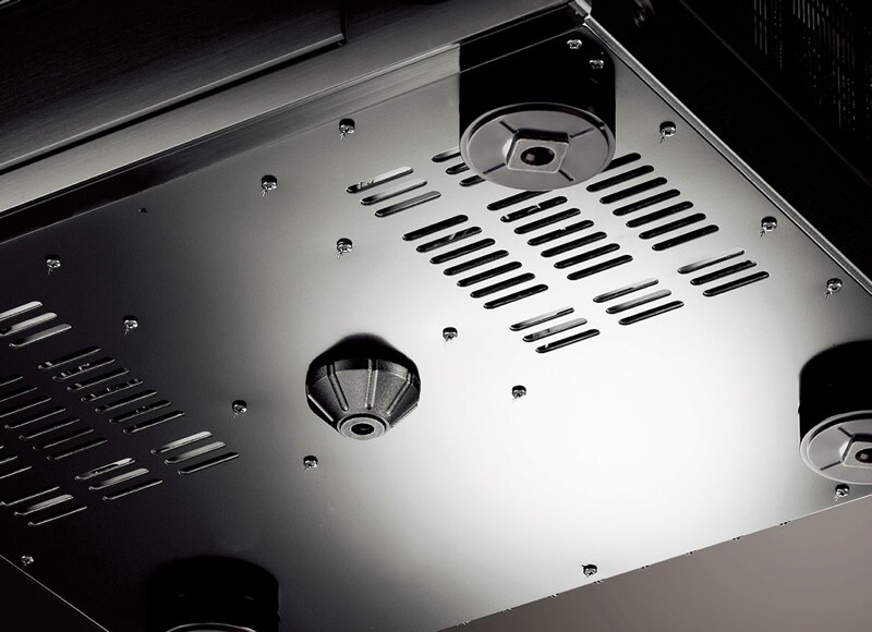 The AVENTAGE model RX-A1080 features a sleek, clean design, with an elegant aluminium front panel. Even more importantly, the unit is exceptionally sturdy, with an interior reinforced with cross members in an H-shape. It also features the Anti Resonance Technology (A.R.T.) Wedge, which is a fifth foot in the centre of the unit that dampens vibrations from the power transformer and elsewhere. Thanks to these, installation stability is improved and chassis resonance is dispersed, effectively eliminating external vibration, maintaining the highest audio quality.