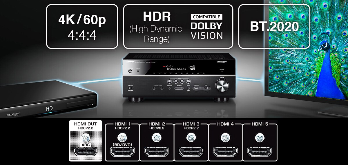 - HDMI® (6 in / 1 out) with 4K Ultra HD full support, HDR Video including Dolby Vision and Hybrid Log-Gamma, and BT.2020