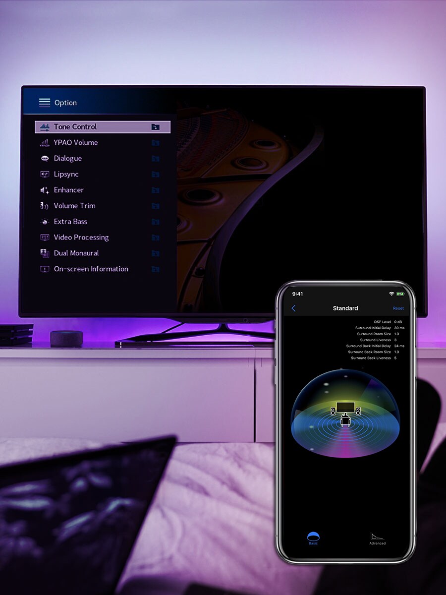 This easy-to-use app lets you conveniently and ‘smartly’ control your AV receiver’s power, volume, input selections, DSP modes — and much, much more — from an iOS or Android™ device. You can also use as many as 23 different languages and customise the interface by hiding unused icons and renaming functions. A tablet version is also available.