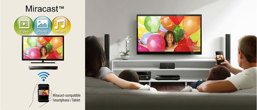 This Blu-ray Disc Player is compatible with Miracast, a wireless standard that lets you connect any Miracast compatible smartphone or tablet for mirroring videos and photos to the player, so the whole family can view them on a widescreen TV. When using a Yamaha AV receiver, you'll enjoy a variety of media mirrored via Miracast with dynamic sound.