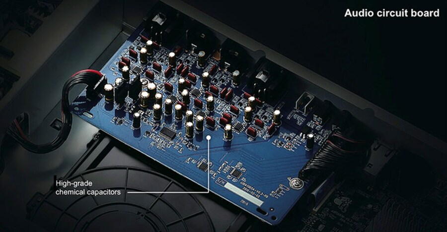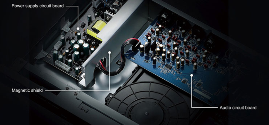 The audio circuit uses block chemical capacitors of the same type used in the high-end AV receivers and all other major parts are selected for highest sound quality. Furthermore, the earth that is the base of the circuit, applied to all parts, both audio and digital have completely eliminated loops; also points were reconsidered to minimise induction and interference for pure and stable earths, eliminating the negative influences on sound quality.