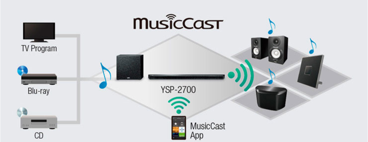 MusicCast employs a high performance wireless network to deliver music and audio enjoyment. It can stream digital music content from your smartphone, PC or NAS to other MusicCast devices in your home. It can also share the music from external devices such as a TV or BD player connected to the YSP-2700. Audio content from Bluetooth-connected smartphones or tablets can also be streamed to MusicCast devices in multiple rooms.