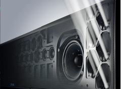 The front panel and the indicator section are covered by a mesh grille, achieving a simple, elegant look. The mesh on each end curves around to the upper panel, subtly asserting surround support. The indicator section lights only when needed, to avoid interfering with viewing. Even with its special vertical beam speakers the unit is only 1100mm, 100mm smaller than the previous YSP-5100 model, and the depth is only 93mm (without stand), making it an extremely slim presence in your room.