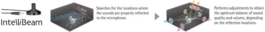 The YSP-5600 employs beam optimisation and sound optimisation features with the aid of the supplied IntelliBeam microphone, allowing you to avoid troublesome listening-based setup and achieve highly accurate sound adjustments that best match your listening environment. Together, these two features are called IntelliBeam. The positions of the sound beams directed at the ceiling can also be automatically set. The YSP-5600 can thus reproduce the live music ambience of a variety of rooms.