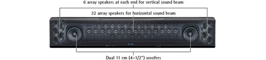 Height channel audio playback is realised by placing six array speakers at each end of the unit (a total of 12). For these array speakers, 28mm diameter units are used. In order to obtain the maximum sound beam effect, they are mounted on an angled baffle and sound beam vertical control is adapted. Sound field reproduction is just as if real speakers were mounted on the ceiling, so you get great sound without the bother of mounting speakers and stringing wires.