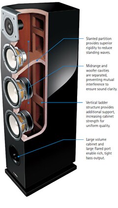 - Two-chamber cabinet (woofer and midrange separated by slanted partition) with vertical bracing
