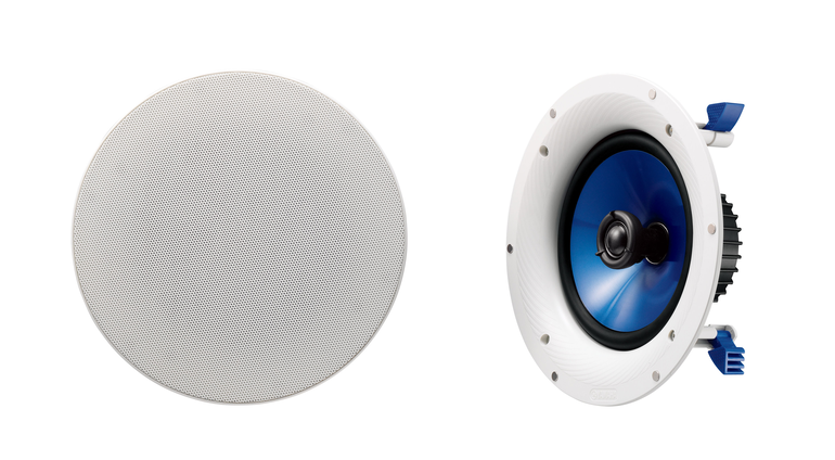 An 8" coaxial ceiling speaker with cone woofer, fluid-cooled soft-dome swivel tweeter, 140W power handling, horn-shaped acoustic baffle and thin, light grille with magnets