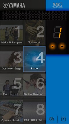 The audio player function features 9 separate banks with 8 tiles that can each be assigned up to 8 songs or sound effects from your iPhone/iPad music library. This provides users with high quality playback of up to 72 songs/ sound effects by simply touching the assigned tile image of each corresponding audio file. This instantaneous playback afforded by MG Rec & Play lends valuable flexibility to live performance applications requiring background music , triggered backing tracks, musical accompaniment, and parties or entertainment functions that require the use of sound effects.