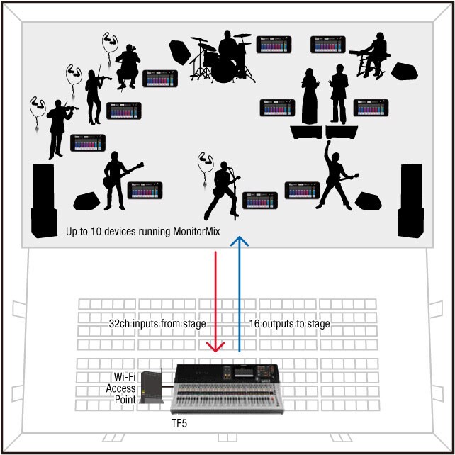 The MonitorMix application for the RIVAGE PM / DM7 / DM3 / CL / QL / TF series allows individual wireless MIX / MATRIX / AUX mixing from up to 10 iOS / Android devices simultaneously.