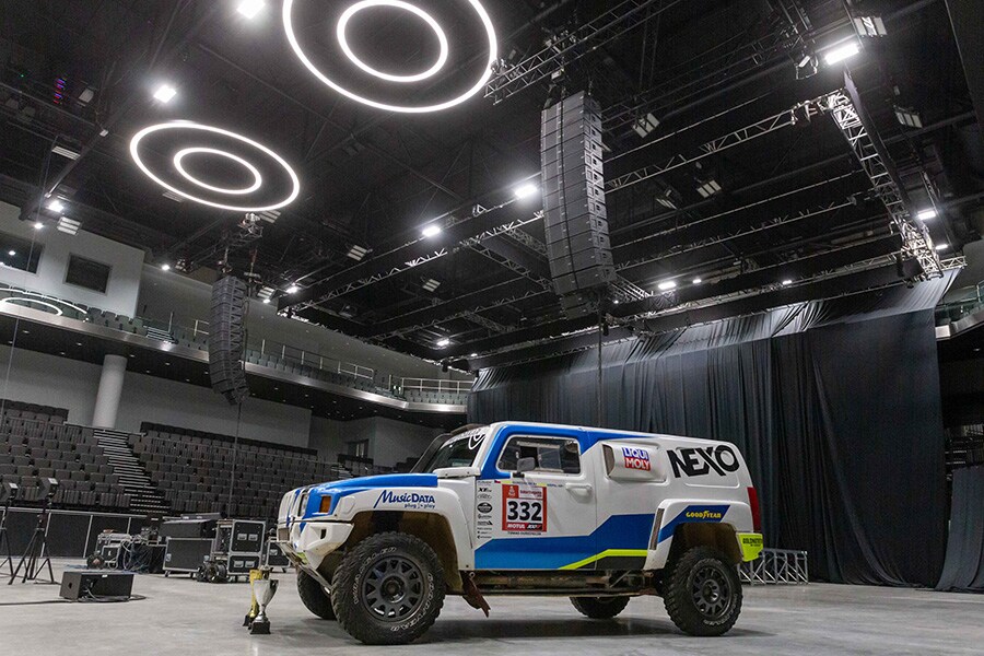 Featuring a wide range of conference facilities and a 4500-seat sports arena, the O2 universum was the perfect location to set up demonstration immersive sound systems in both the largest conference room and the arena, as well as comparing them to a large format NEXO L-R line array system flown in the arena.