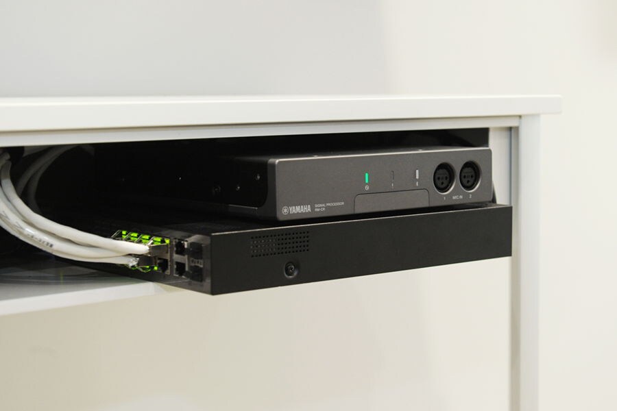 RM-CR Remote Conference Processor and SWR2311P-10G L2 Switch installed on a shelf below the monitor (brought out for photography)