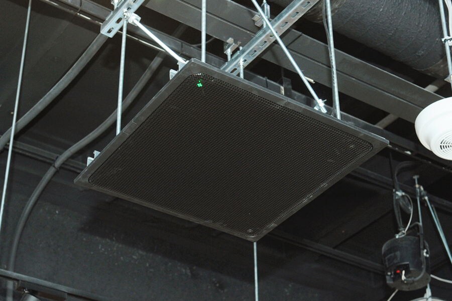 Enlarged ceiling detail of photo at left: RM-CGB ceiling microphone suspended from skeleton ceiling with wire