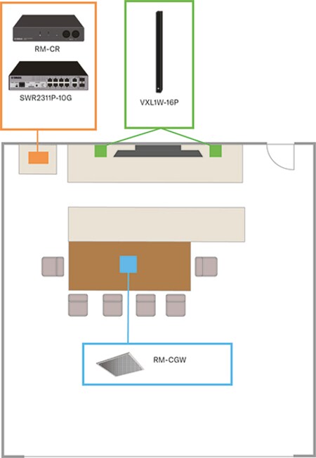A combination of an RM-CR remote conference processor, Yamaha VXL1W16P DANTE PoE line array loudspeakers, a Yamaha SWR2311P10G L2 network switch and the Yamaha RM-CG ceiling array microphone are used. Together they form the ADECIA ceiling solution.