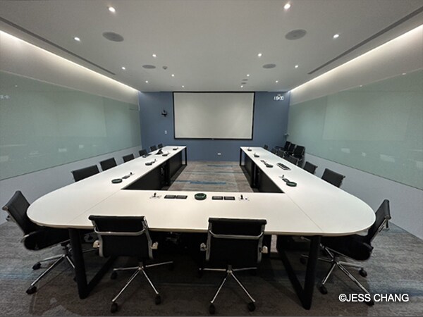 An RM-CG ceiling array microphone is installed in the video conference room for senior executives. The Dante-compatible unit is equipped with a four way auto-tracking beamforming array and unique digital signal processing (DSP) technologies. These allow it to automatically detect who is speaking and pick up the sound from that area, while reducing unwanted noise from other areas, such as papers and cups being moved.