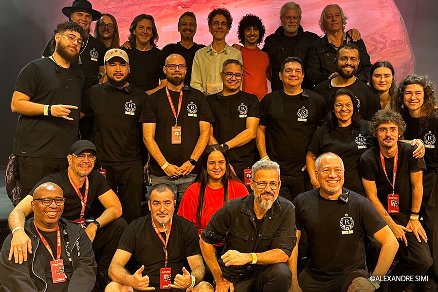 The Nando Reis touring crew: Nando Reis (back row, centre), Alexandre Simi (middle row. fifth from left)