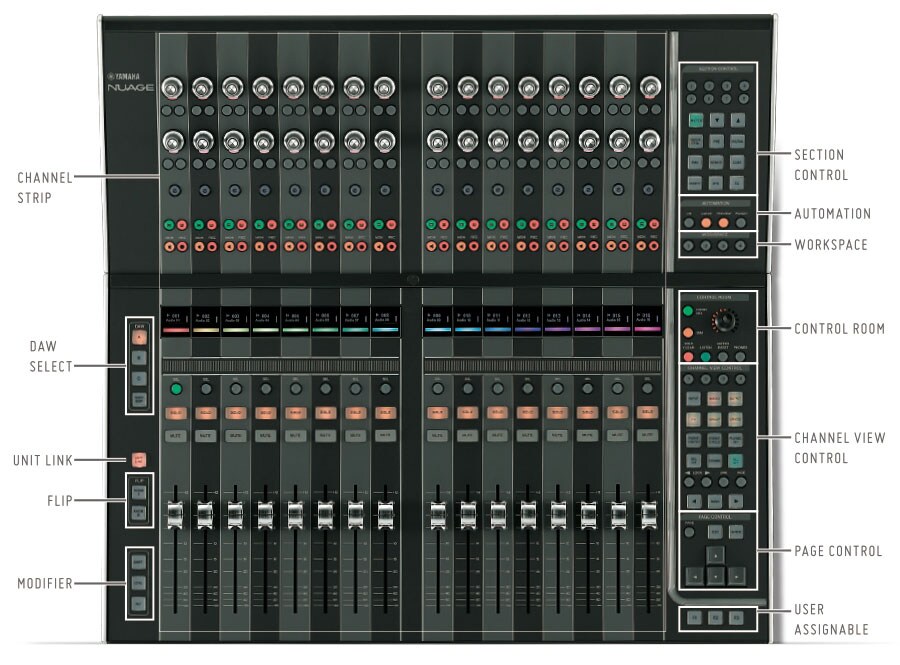 [CHANNEL STRIP] : Each channel strip has a touch-sensitive 100mm motor fader, two multi-function knobs, and a channel name/icon/color display.