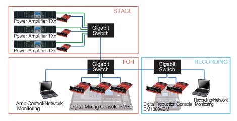 In this figure, a Yamaha LS9 console is acting as the HA Remote controller. It is connected via the primary Ethernet port on the installed Dante-MY16-AUD card to a network switch. The Dante-MY16-AUD card is set to HA Remote Mode 2, via Dante Controller (For detail, please see Dante-MY16-AUD User Guide v1.23)