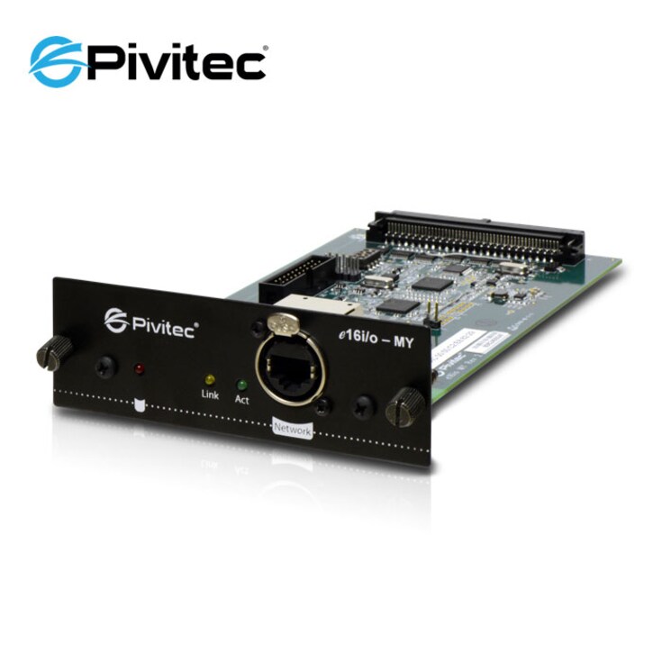 The Pivitec e16i/o-MY 16 is a Mini-YGDAI 16-channel bidirectional network interface card for Yamaha digital consoles.