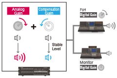 One obvious drawback of connecting multiple consoles to a single I/O rack unit is that gain adjustments made from one console can cause unexpected gain changes at the other consoles. The Gain Compensation function implemented in the CL consoles ensures that when the analog gain stage is adjusted from one of the consoles, corresponding compensation is automatically applied at the digital stage so that the level sent from the I/O rack unit to the connected CL consoles remains constant.