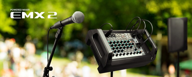 - The EMX2's lightweight and portable design make it very easy to carry and particularly useful for parties or DJ events when a fast and easy setup is desired.Users can easily mix in audio from a PC or external audio source using AUX inputs along with mic inputs.