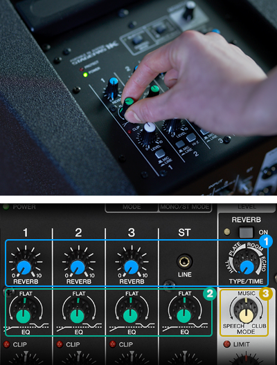 STAGEPAS 1K comes equipped with a wealth of sound shaping functions, including 1-knob EQ for optimized multi band EQ setting, industry standard SPX reverb, and the “Mode” control for master output compression settings that match various applications such as “Speech” or “Music.” Each of these functions can be set via a single knob, and have simplified many of the tough tasks like EQ and compression to get you great sound fast.