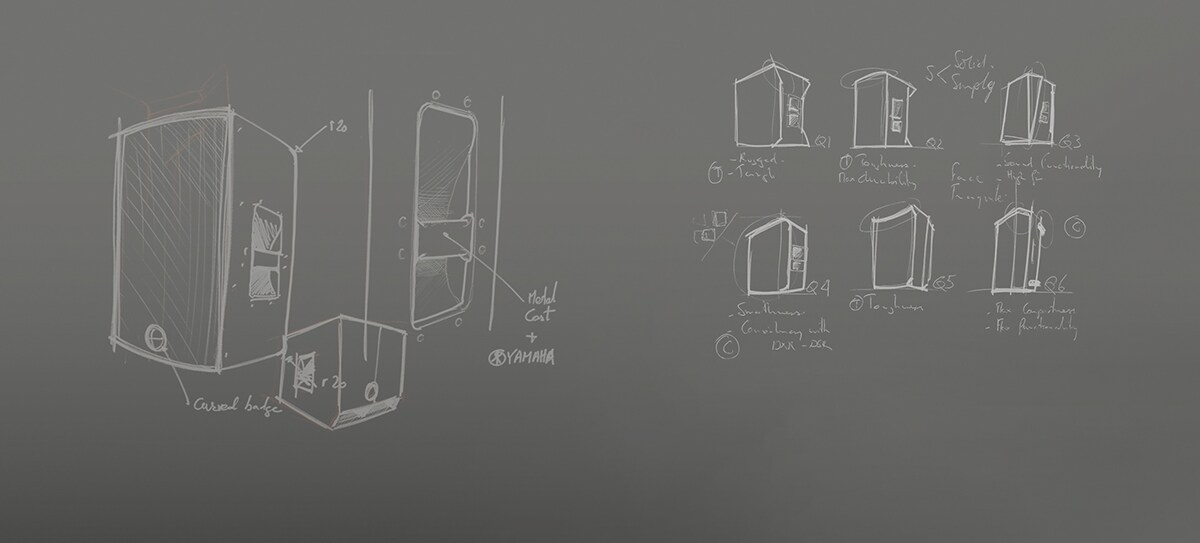 After designing and developing the DSR/DXR/DBR Series speakers, it was clear to us that the simple yet flexible enclosure would have a broad appeal and, as a result, would be widely accepted throughout the sound reinforcement community. This was an important consideration throughout the design of the DZR, maintaining consistency with the Yamaha speaker design philosophy of simplicity, but also making a subtle expression of the speaker’ s higher power and superior performance. In fact, our first sketch design presentation was centered around a “simply solid” concept, and after a lengthy trial and error process we finally settled on what we considered to be an uncompromising realization of our vision of an ideal loudspeaker for sound professionals.