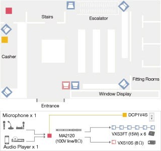 The combination of VXS3F/VXS3FT speakers and VXS10S/VXS10ST subwoofers is recommended to enhance the power and excitement of rhythmic music. A single unit of MA2120, which has independently controllable two output channels, would be a good choice for broadcasting announcements or advertisements while supplying background music. It allows users to create a comfortable, agreeable environment by carefully adjusting the output volume of each channel. The DCP1V4S control panel installed in the area allow remote control of background music volume and other operations.