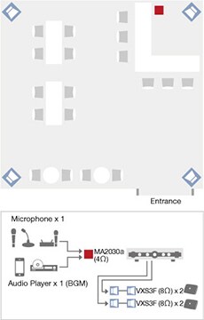 The VXS3F (Low-impedance model) is ideal for smaller installations such as retail stores where just a few speakers will be used to cover the service area. Wide dispersion allows effective coverage with a minimum number of speakers. The MA2030a is a stylish mixer amplifier that can be easily used without any prior audio experience. All you need to get started is the MA2030a, VXS3F speakers, and a music source of your choosing. You can add a microphone for announcements and small events if necessary, easily broadening the scope of your business.