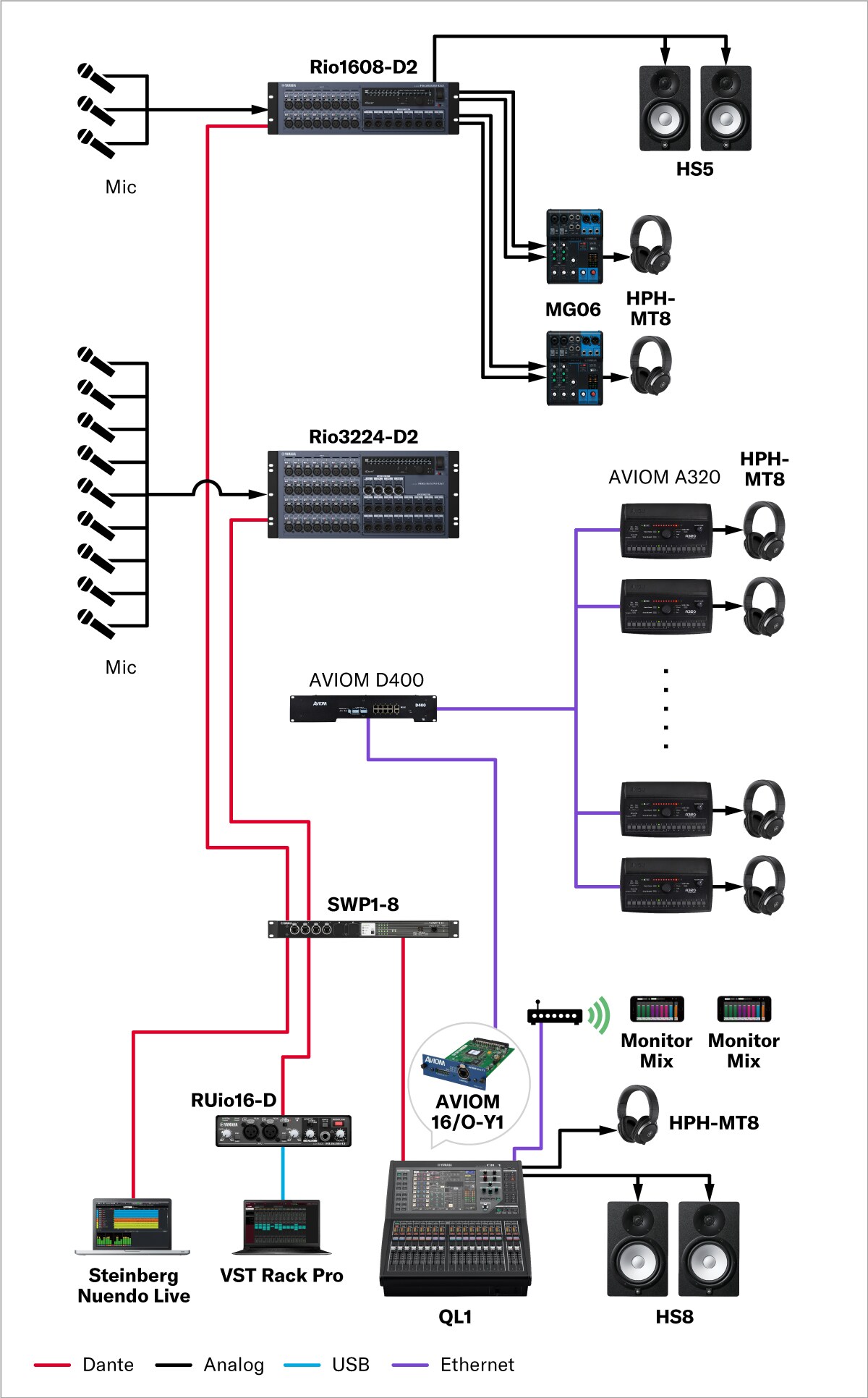 This is a system for music and voice recording. From single microphone setups to simultaneous recording of dozens of channels, Yamaha equipment and software allow you to configure a system that ideally suits your objectives, scale, and budget. By utilizing an audio network such as Dante, wiring can be simplified significantly without sacrificing sound quality.