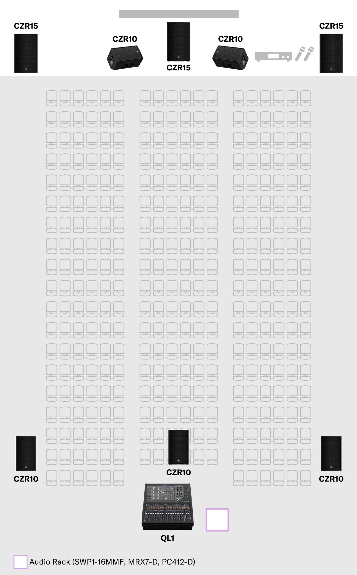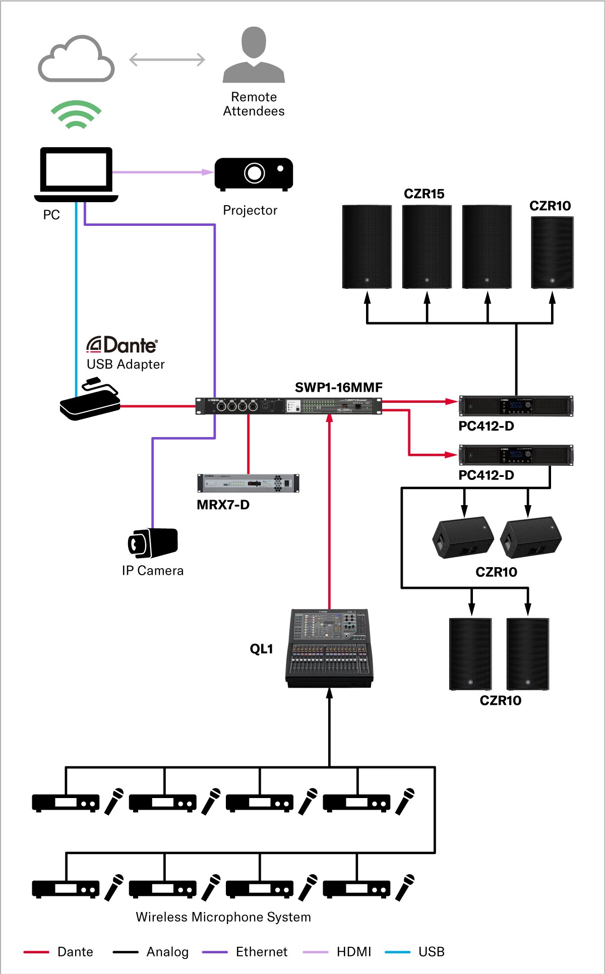 • Constructing a system centered on a Dante-compatible mixer also allows flexible support for venues such as auditorium. The CZR series offers both high sound quality and powerful output, and allows horn rotation for optimal coverage whether installed vertically or horizontally. The PC-D series power amplifiers come equipped with CZR series presets for easy configuration of ideal DSP settings.