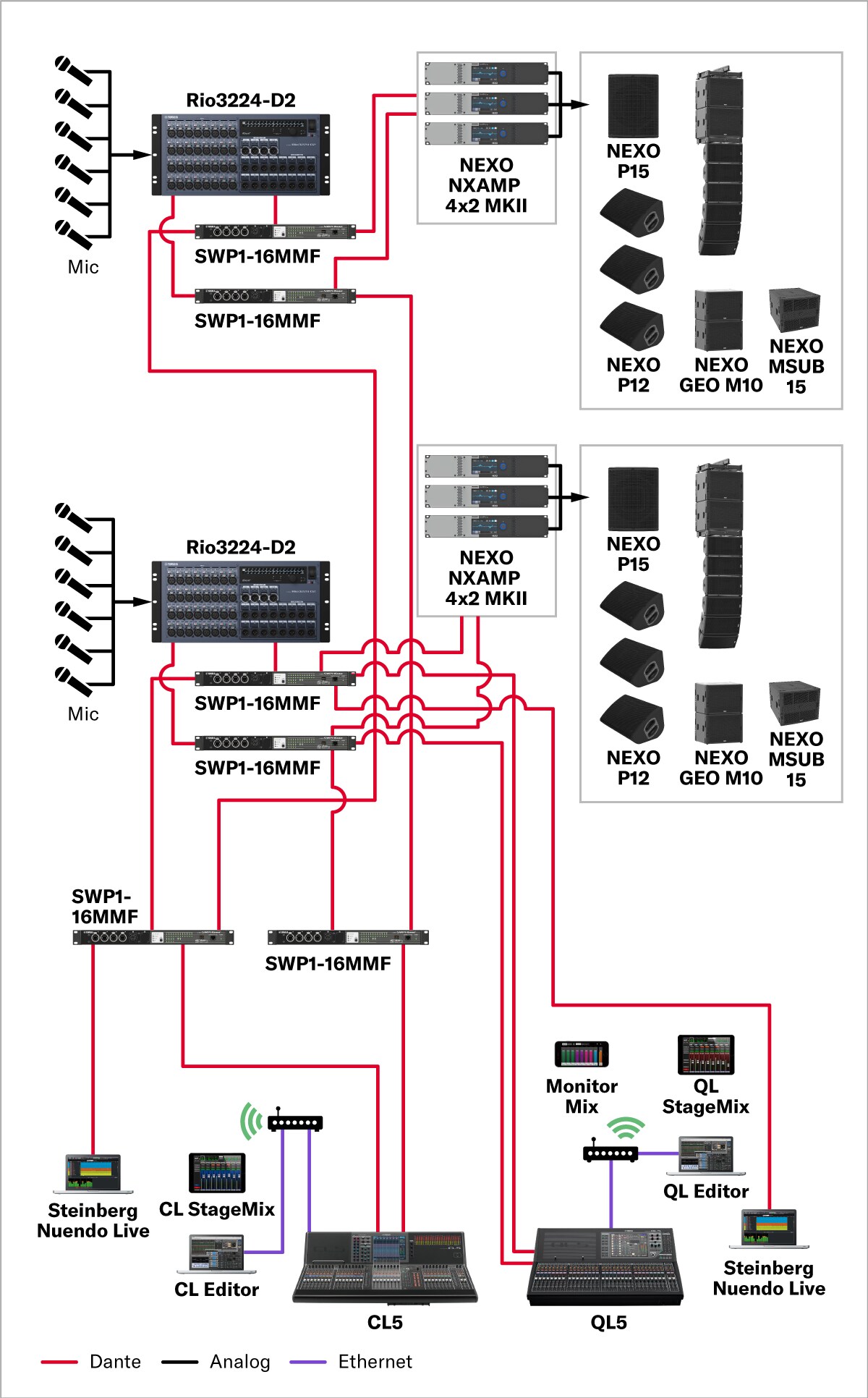This system is suitable for live concerts in outdoor venues for up to several thousand people. A compact yet powerful mixing console capable of sophisticated, large-scale setups combines with high-quality speakers capable of output levels that bely their diminutive size and weight to deliver clear, consistent, and powerful sound to the entire audience. System configuration, routing, and connectivity is simplified significantly through the use of an audio network which enables operation by a small number of people and reduces the time and labor required for system set up and tear down.
