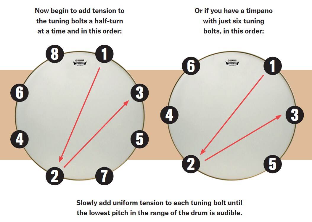 - Next, using a hard timpani mallet, gently strike the head very close to the no. 1 tuning bolt (see image above). Using your tuning device, verify the pitch of that tuning bolt position and adding just ½ turn of the tuning key, increase the tension of the tuning bolt.
