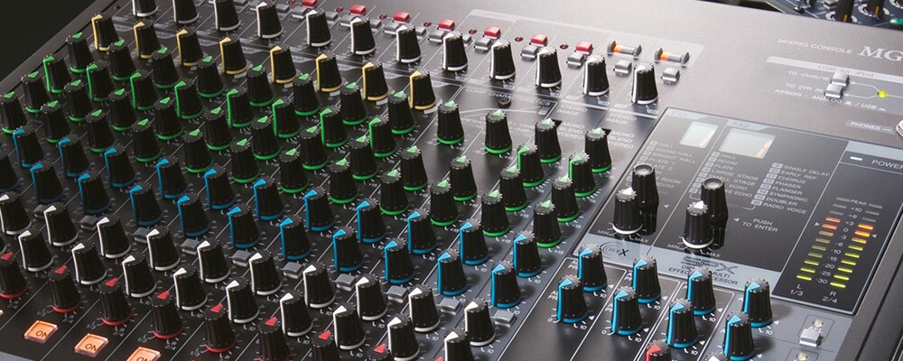 The heart of the live sound system is the mixer. The mixer’s basic function is to mix the live sources from the stage to produce a good balance for everyone in the audience to hear. A simple analogue mixing console provides basic control over the sound sources, allows the operator to mix them together and control the overall output level of the mix.
