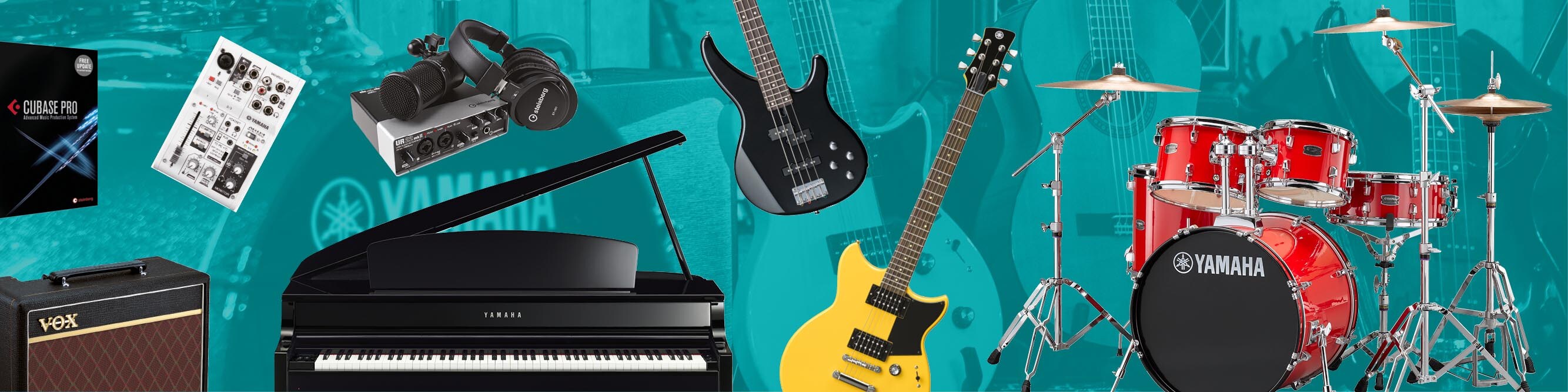 • $45,000 value of instruments: Acoustic Drums, Drum Mics, Electric Drums, Drum Stool, Drum Sticks, Electric Guitars, Electric Bass Guitar, Guitar Wireless, Guitar Effects, Guitar Amps, Bass Amp, Guitar Cables, Digital Pianos, Mixer, Speakers, Subwoofers, Wireless Mics, Recording Software (Cubase), Notation Software (Dorico), Clavinova Digital Baby Grand Piano, Macbook Pro.