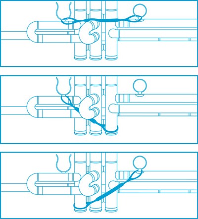 ・Hook the ring on one end of the slide stopper onto the first valve finger hook. Hook the other end onto the third valve hook.