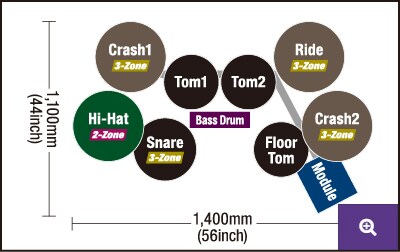 - 3-zone pads for the crash, and ride. The cymbals can be choked and muted. The ride cymbal is equipped with a hit point detection function (positional sensing)
